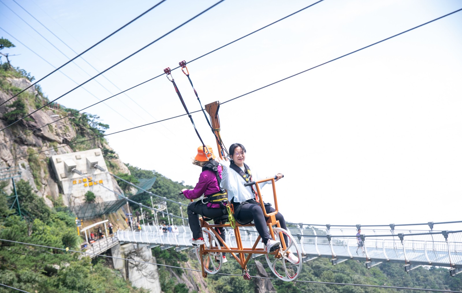 乘坐索道十分钟后抵到达山巅,今日阳光正好,清风徐徐,体感适宜。彩虹滑草的五彩缤纷,绿绿草地的一望无际,仅仅是伫立在此,已是一种享受;登临老鹰巢观景台、鸟巢观景台,是视觉震撼的云海奇观,光影薄雾中的山峰若隐若现,给人一种虚无缥缈之感;队员行走在水晶廊桥、云海栈桥、天空之阶、云中漫道,高空中的轻微晃动就让人尖叫不已,山涧在脚下显得深不可测、缥缈的云雾又给紧张的氛围添上一笔。悬崖秋千是云上草原的王牌项目之一,公海gh555000aa线路检测人秉承着公海gh555000aa线路检测无畏的精神和勇敢的斗志荡漾在悬崖之巅……