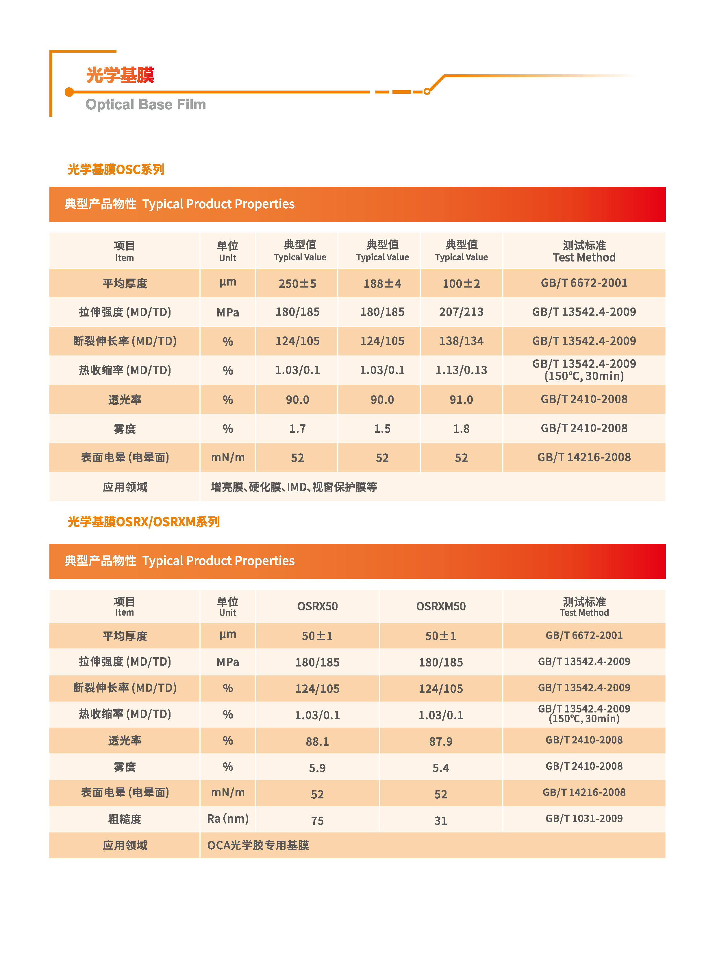OSC系列:主要应用增亮膜、硬化膜、IMD、视窗保护膜 OSRX/OSRXM系列主要应用于OCA光学胶专用基膜